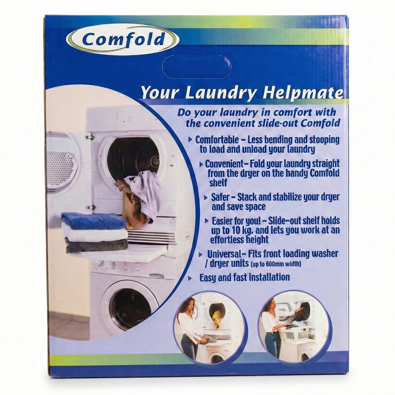 ייחודו של מדף COMFOLD הוא המדף הנשלף המובנה, המאפשר לפרוס, לקפל או למיין כביסה מיד עם הוצאתה מהמייבש – ללא צורך במשטח נוסף. המדף הנשלף מספק פתרון פרקטי במיוחד לחללים קטנים, חדרי כביסה או דירות בהן נדרש ניצול חכם של המקום.