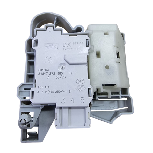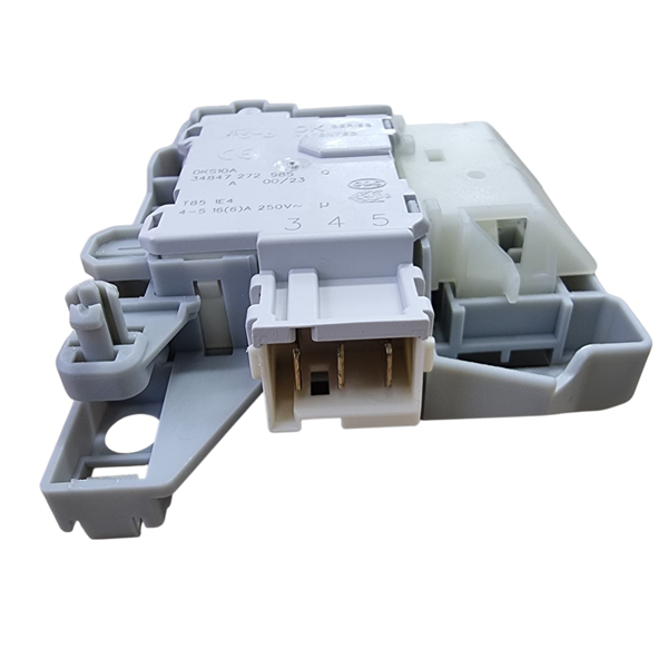 מנגנון נעילת דלת למכונת כביסה (Interlock) – יחידת נעילה/איתות המשלבת תפס ומגעים חשמליים לאישור סגירה.